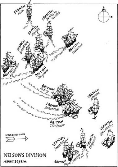 Введя в действие аварийное рулевое управление, Харди теперь мог прорезать строй, но, опасаясь почти неминуемого столкновения либо с «Буцентавром», либо с «Редутаблем», он обратился к Нельсону. Адмирал ответил: "Ничего не поделаешь. Не имеет значения, с кем мы сойдемся в абордаже. Иди на любого, сам сделай выбор". Харди решил схватиться с меньшим из них. Двадцать человек потянули канаты, прикрепленные к румпелю, и положили руль лево на борт.