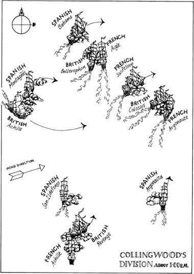Для своей дивизии план Нельсона сработал достаточно эффективно, но ближе к арьергарду противника исход действий был менее определенным. Прорвав вражеский строй слишком далеко от концевого корабля, Коллингвуд схватил слишком большой кусок, чтобы его можно было успешно разжевать. Корабли, следовавшие за ним в непосредственной близости, оказались в опасности неравного боя до того, как подоспеют концевые корабли его колонны.