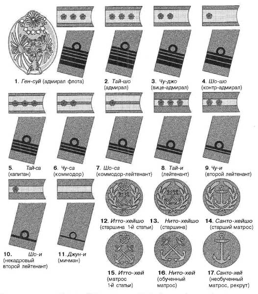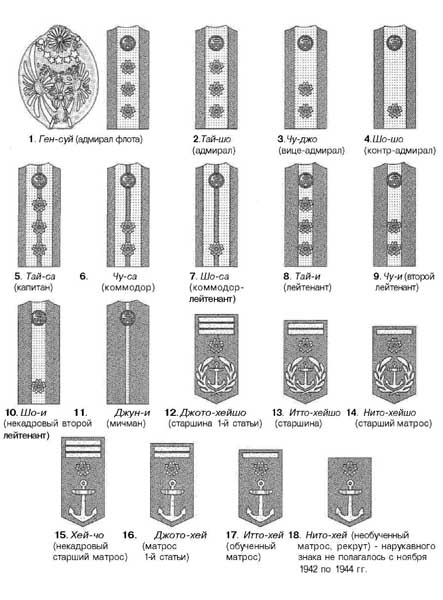 Шо-кан – флаг-офицеры (1–4): темно-синяя нашивка с широким золотым просветом; от трех до одного серебряных металлических цветков вишни. На обшлагах две широких и от трех до одной средних черных нашивки. (1) – цветной эмалевый знак, носившийся на правой стороне груди. Са-кан – старшие офицеры (5–7): темно-синяя нашивка с двумя средней ширины золотыми просветами; от трех до одного серебряных металлических цветков вишни. На обшлагах от четырех до трех средних или две средних и одна узкая черные нашивки. И-кан – младшие офицеры (8—10) и джунши-кан – мичман (11): темно-синие нашивки с одним средним золотым просветом; от трех до одного серебряных металлических цветков или без цветка (11). Нашивки на обшлагах – две средних, средняя с узкой, одна средняя или одна узкая. Каши-кан – старшины (12–14): красный цветок, эмблема рода войск (здесь якоря – плавсостав) и венок на темно-синем круге. Хей – матросы (15–17): красный цветок и эмблема рода войск на темно-синем круге.