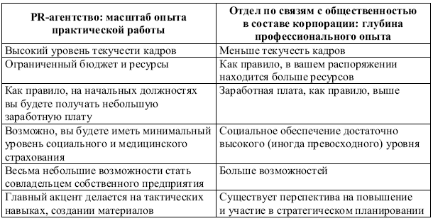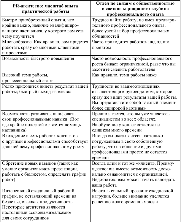 Недавние выпускники вузов часто взвешивают «за» и «против» выбора: работать в составе отдела по связям с общественностью какой-либо корпорации или в агентстве по связям с общественностью. Ниже мы приводим краткое резюме некоторых плюсов и минусов этого выбора: