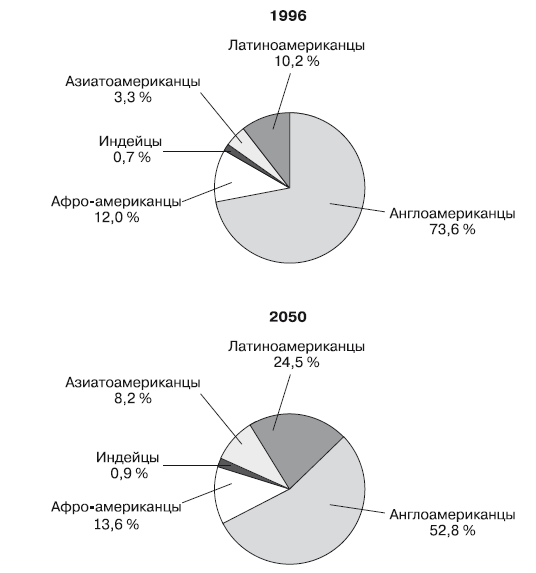 В последнее время численность легко идентифицируемых этнических групп – в первую очередь латиноамериканцев, афро-американцев, азиатоамериканцев и индейцев – в целом росла в пять раз быстрее, чем основного населения. Бюро переписи США предсказало, что к 2010 г. латиноамериканцы и афро-американцы будут составлять по 13% населения США, что в сумме составит 26%, в то время как англоамериканцев будет всего 58%. Выходцы из Азии и индейцы удержат имеющуюся долю численности. По прогнозам Бюро переписи, еще большие перемены произойдут к 2050 г. – в частности, латиноамериканцы составят почти четверть населения Соединенных Штатов (рис. 11.1).