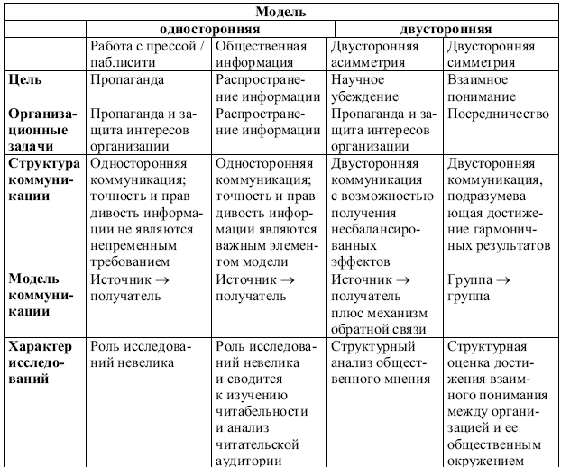 Для того чтобы лучше понять историю институционального развития связей с общественностью, так же как и сегодняшнюю практику работы специалистов в этой области, профессора Джеймс Е. Грюниг (Университет Мэриленд) и Тодд Хант (Рутгерс, Университет штата Нью-Джерси) разработали четыре модели. В настоящее время применяются все четыре модели, но «идеальной» (которая приобретает все большую популярность) является только одна – модель двусторонней симметрии.