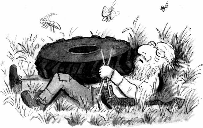Мистер Ворчун-старший лежал на траве лицом кверху, а под его попой валялись обломки трёхногой табуретки, упавшей одновременно с ним. В руке мистер Ворчун-старший всё ещё держал вязальные спицы, а с них свисала длинная, тонкая шерстяная нить. Его прижимала к земле огромная тракторная шина.