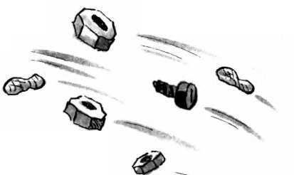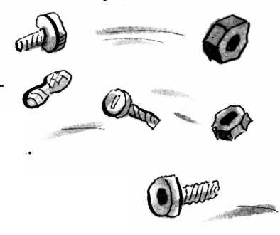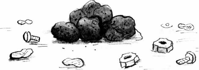 Она запустила руки в карманы платья и вытащила горсть болтов (которые обычно лежат в ящике для инструментов вместе с шурупами и гвоздями) и бобов (которыми обычно кормят слона).