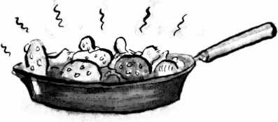 Лучик помешал мухоморы в сковородке деревянной лопаточкой.