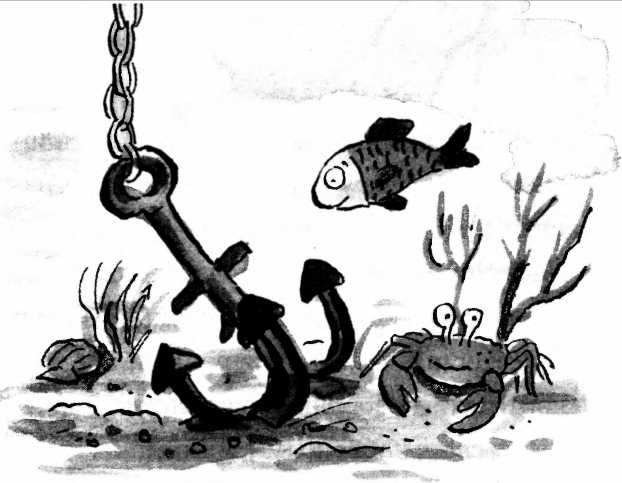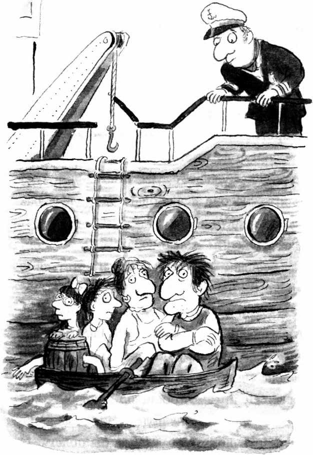 Когда мистер Ворчун добрался до самой верхней ступеньки верёвочной лестницы, он оступился и полетел вниз. В полёте он схватился за миссис Ворчунью, так что не думайте, что вернуться на борт было так просто, как кажется. Сперва Ворчунов пришлось снова вылавливать из воды. По очереди. Гарпуном.
