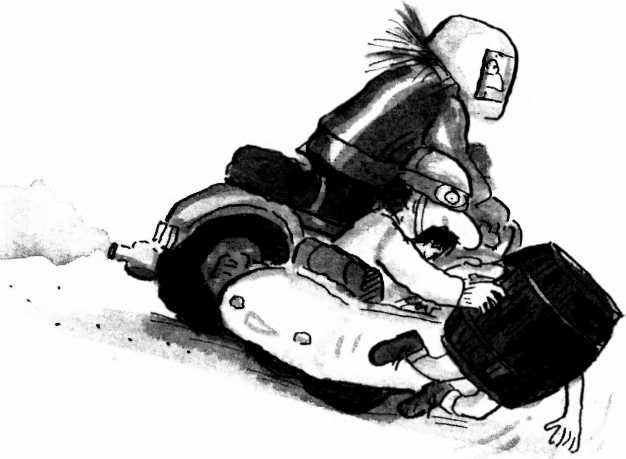 Не успел никто понять, что происходит, как Макс высунулся из коляски и схватил ОЗО вместе с бочкой. Мотоцикл понёсся дальше, унося ОЗО с собой, а тот кричал и брыкался.