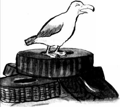 Миссис Ворчунья тем временем пробежала по забрызганному маслом двору ремонтной мастерской Стэна, мимо древнего бензонасоса и горы шин на продажу. Чайка, присевшая было на верхнюю шину, заметила решительность на лице миссис Ворчуньи и поняла, что надо отсюда бежать, точнее, улетать, и немедленно. Она пронзительно крикнула и поспешно отлетела в сторону.
