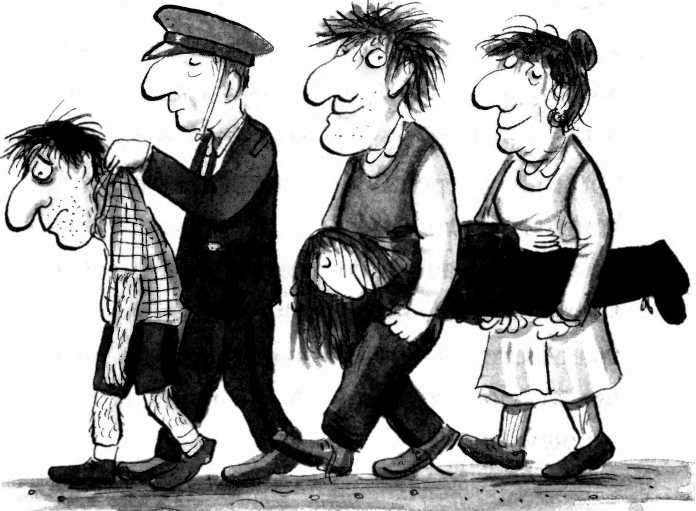 И тут мимо промаршировал сержант Нужди. Он вёл Макса, держа его сзади за ворот рубашки, а за ним шли Ворчуны и несли Марту параллельно земле, как носят гладильные доски. Мистер Ворчун держал Марту за плечи, а миссис Ворчунья – за ноги.