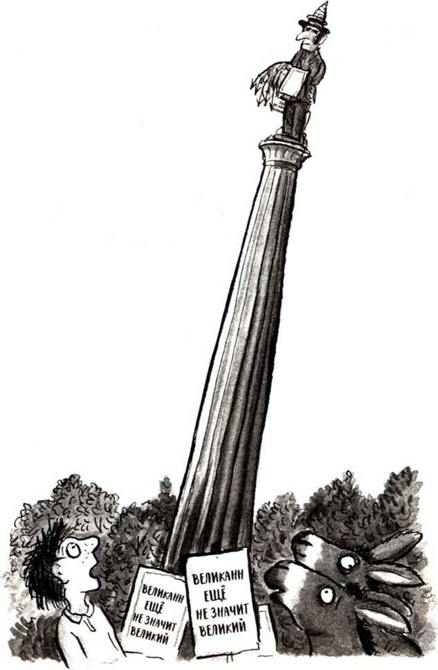И в-третьих, холмик был весь истыкан табличками: «ВЕЛИКАНН ЕЩЁ НЕ ЗНАЧИТ ВЕЛИКИЙ». Одна из них свисала с шеи статуи на верёвке. Каменный цилиндр был частично прикрыт оранжевобелым дорожным конусом, небрежно надетым сверху.