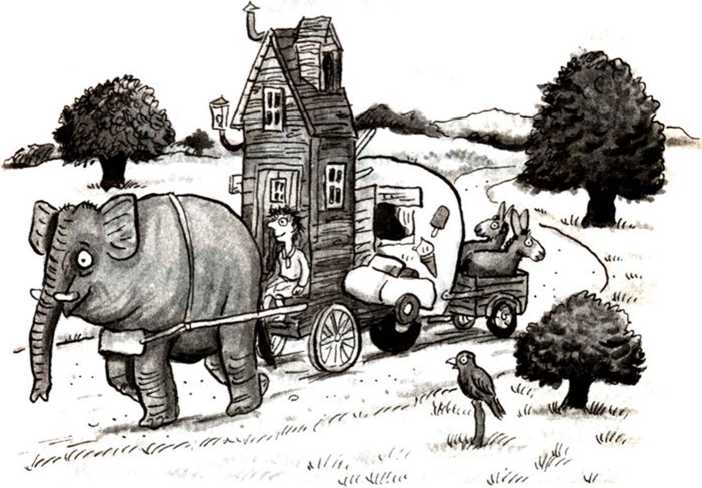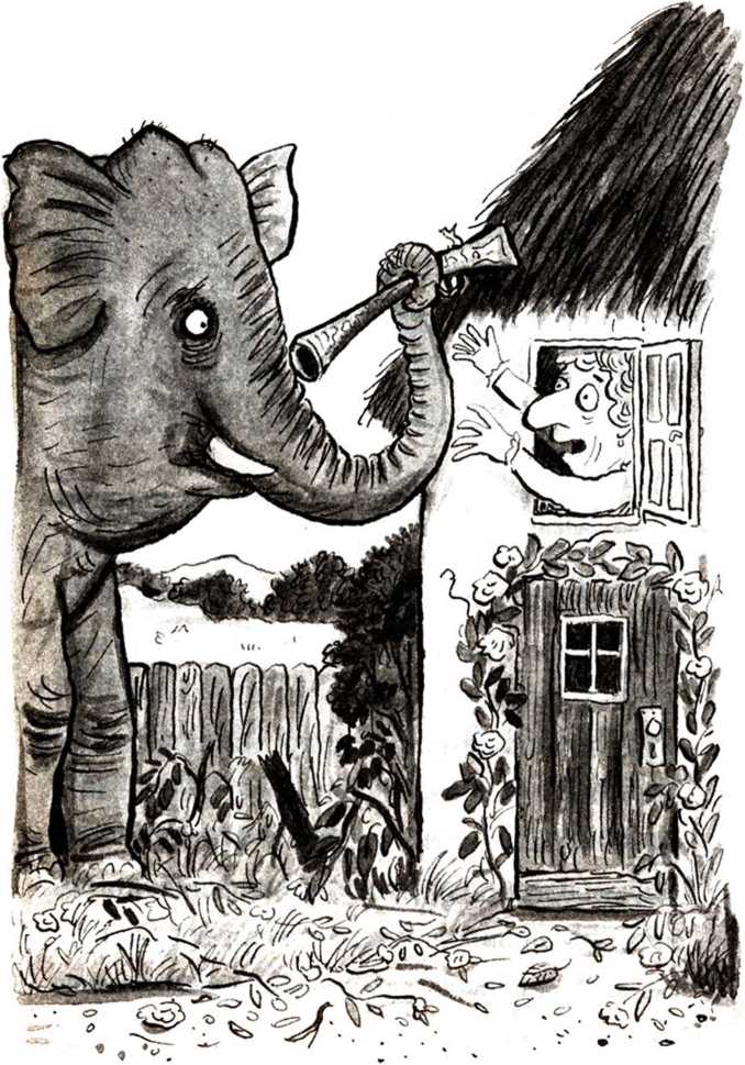 Выйдя на улицу, он увидел, что мистер Ворчун болтает с Пальчиком, облокотившись о слона, как о стену. А слон смотрит на него своими умными глазами.