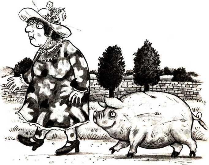 И тут крупная дама в большой шляпе с широкими полями, украшенной цветами, подошла к ним, а за ней ещё более толстая (и безумно грязная) свинья. Они обе с большим интересом уставились на Пальчика.