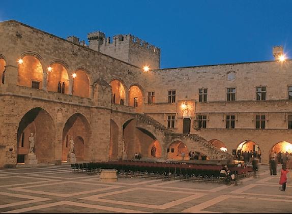 Улица Рыцарей выходит на площадь Платиа Клеовулу (Platia Kleovoulou) со входом во **Дворец Великих Магистров (6). Громадное здание шириной 75 и длиной 80 м занимает самую высокую точку Старого города, возвышается над гаванью Мандраки и видно издалека. Дворец с зубчатыми стенами и угловыми башнями похож на могучую крепость, вросшую в городскую стену. Нынешний облик Дворца – творение итальянцев: они возвели его в 1937-1940 гг. на руинах дворца времен иоаннитов (1309-1523), от которого после многочисленных землетрясений и взрыва порохового склада в 1856 году остались лишь фрагменты первого этажа и некоторых башен. Внешне реконструкция следует историческому образцу. Однако планировка внутренних помещений и их внутреннее убранство были полностью изменены, потому что дворец был предназначен для администрации и резиденции итальянского губернатора.