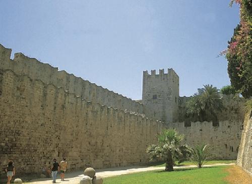 Весь Старый город Родоса окружен четырехкилометровой средневековой *Городской стеной, почти полностью сохранившейся. Когда в 1309 году рыцари-иоанниты захватили Родос, они поначалу перестроили старые византийские городские стены. Но успешно выдержанная осада турок в 1489 году ясно показала им, что эти стены не устоят перед новой атакой. Рыцарский Орден пригласил на остров самых выдающихся архитекторов крепостных сооружений того времени и велел укрепить старую стену по последнему слову оборонительной техники. Когда в июне 1522 года турки начали осаду города, стена достигала 20 метров в высоту и 12 метров в толщину. Многочисленные бастионы выступали над широким, специально вырытым крепостным рвом, который, впрочем, никогда не заполнялся водой. В некоторых местах рва были оборонительные островки. Первое препятствие на подступах со стороны открытого поля представлял крутой контрэскарп. К тому же рыцарский квартал Collachio был отгорожен от остальной части Старого города еще одной, более низкой стеной.