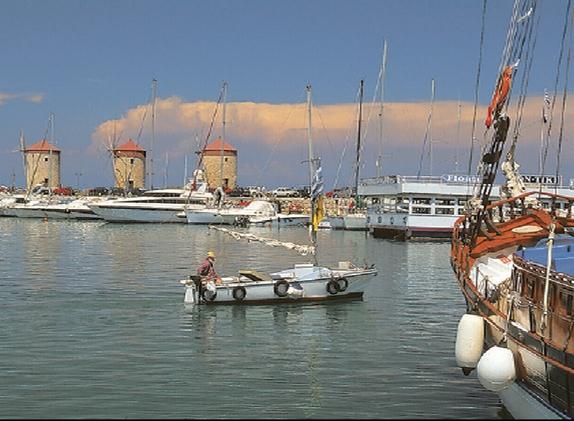 Сегодня *гавань Мандраки (25) служит причалом для яхт и несметного числа экскурсионных кораблей, ежедневно отправляющихся в Каллитею, Линдос и на остров Сими. В античные времена Мандраки был военным портом города; здесь также причаливали галеры иоаннитов. Сооруженный еще в античные времена четырехсотметровый мол отгораживает гавань от открытого моря. На нем стоят три ветряные мельницы (1496), а у самого мыса – построенная в 1464-1467 гг. пограничная крепость Святого Николая (Agios Nikolaos) с огромной круглой башней, диаметр которой превышает 17 м. Находившимся в ней рыцарям предписано было защищать гавань.