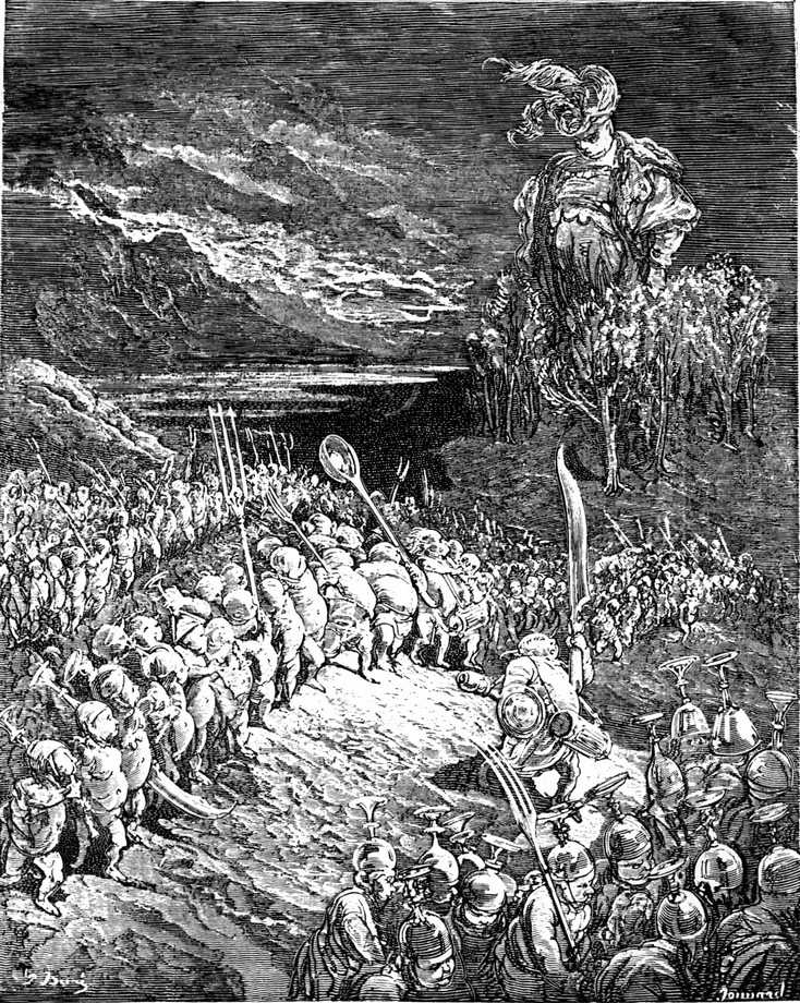 При этих словах Пантагрюэль встал из-за стола и пошел осматривать окрестности, но тут же возвратился и сообщил нам, что налево засели в засаду жирные Колбасы, а направо, в полумиле оттуда, многочисленный отряд могучих Колбас-великанов спускается с бугорка и под веселящие звуки волынок и флажолетов, дудок и пузырей, флейт и барабанов, труб и рожков стремительно на нас надвигается.