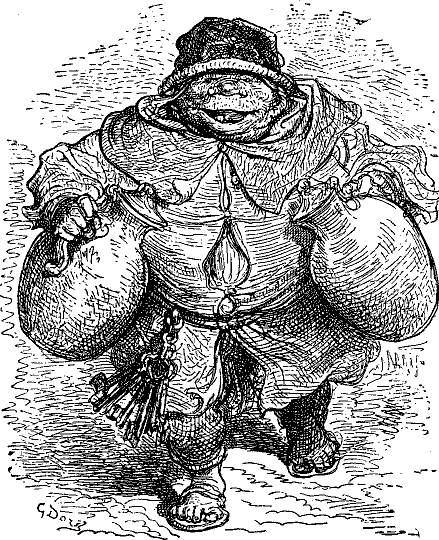 Добряк Грангузье, выпивая и веселясь с гостями, услышал страшный крик, который испустил его сын, появившись на свет. «Лакать! Лакать! Лакать!» – взывал ревущий младенец. Тогда Грангузье воскликнул: «Ке гран тю а!..» – что означало: «Ну и здоровенная же она у тебя!..» Он имел в виду глотку. Присутствовавшие не преминули заметить, что по образцу и примеру древних евреев младенца, конечно, нужно назвать Гаргантюа, раз именно таково было первое слово, произнесенное отцом при его рождении. Отец изъявил свое согласие, матери это имя тоже очень понравилось. А чтобы унять ребенка, ему дали тяпнуть винца, затем окунули в купель и по доброму христианскому обычаю окрестили.