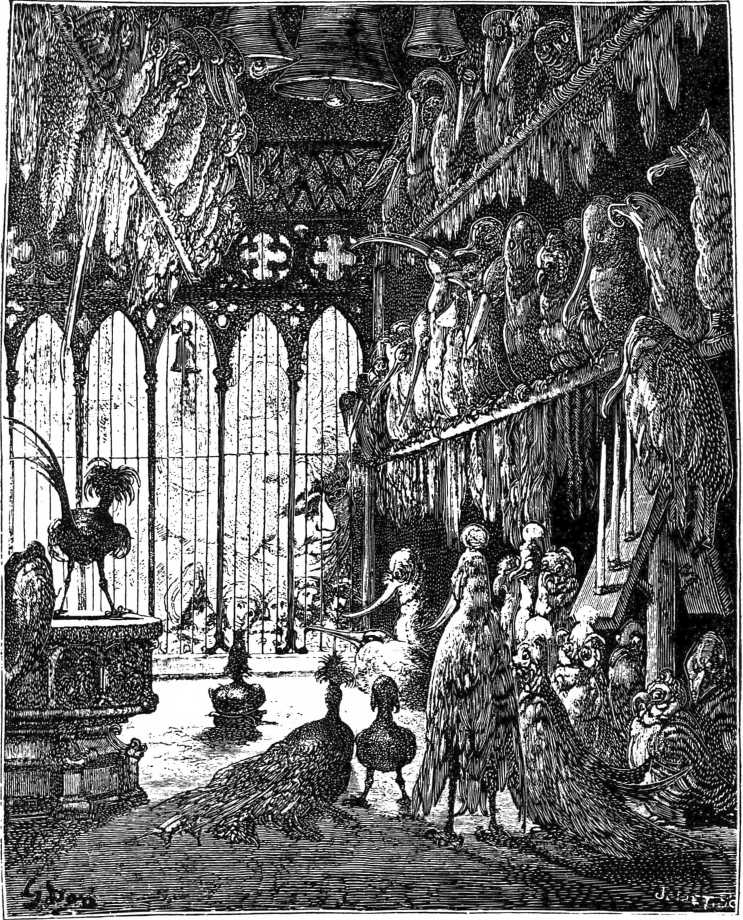 Затем старичок ни о чем другом уже с нами не говорил, кроме как о клетках да о птицах. Клетки были большие, дорогие, великолепные, сработанные на диво. Птицы были большие, красивые, приятные в обращении, живо напоминавшие моих соотечественников; пили и ели они, как люди, испражнялись, как люди, спали и совокуплялись, как люди; словом, с первого взгляда можно было подумать, что это люди; и все же, как пояснил нам мэтр Эдитус, это были не люди и, по его словам, не принадлежали ни к мирянам, ни к белому духовенству. Оперение их также заставило нас призадуматься: у одних оно было сплошь белое, у других – сплошь черное,[1179]1179