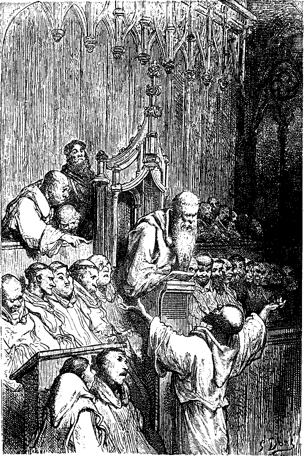 Вот этот-то самый монах, услышав шум, производимый неприятелем на виноградниках, вышел узнать, в чем дело; когда же он обнаружил, что враги обрывают виноград и что, таким образом, монастырь лишится годового запаса вина, то побежал на клирос, где в это время монахи с видом литейщиков, у которых от колокола остались одни черепки, тянули:
