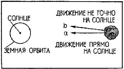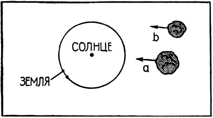 – Вот орбита Земли вокруг Солнца. В настоящий момент мы находимся здесь. А облако, нарисуем его в масштабе, находится здесь. Если оно движется, как показано в случае а, прямо к Солнцу, оно, несомненно, закроет его от нас. Если же оно движется так, как показано в случае б, то весьма вероятно, что оно пролетит мимо, за пределами орбиты Земли.