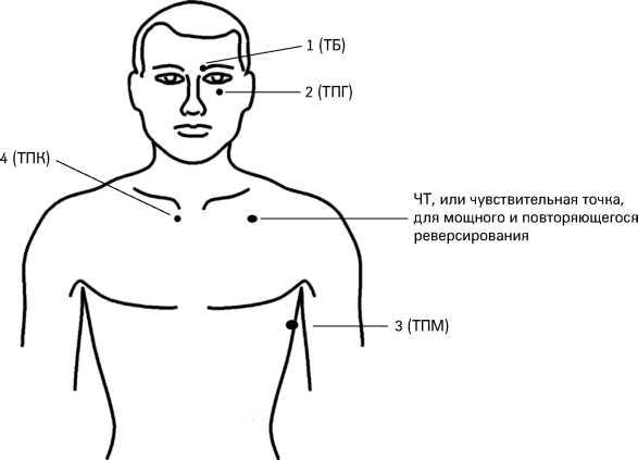3. Посмотрите на табл. 18 и рис. 20, чтобы определить расположение ТБ, ТПГ, ТПМ и ТПК. Думая о травматической ситуации (при этом не слишком усердствуйте, чтобы не испытывать сильного дискомфорта во время процесса), пять раз легким постукиванием надавите на каждую из этих точек. Воздействуйте на них в следующей последовательности: 1, 2, 3, 4. Постукивание не должно вызывать боли, но быть при этом ощутимым.