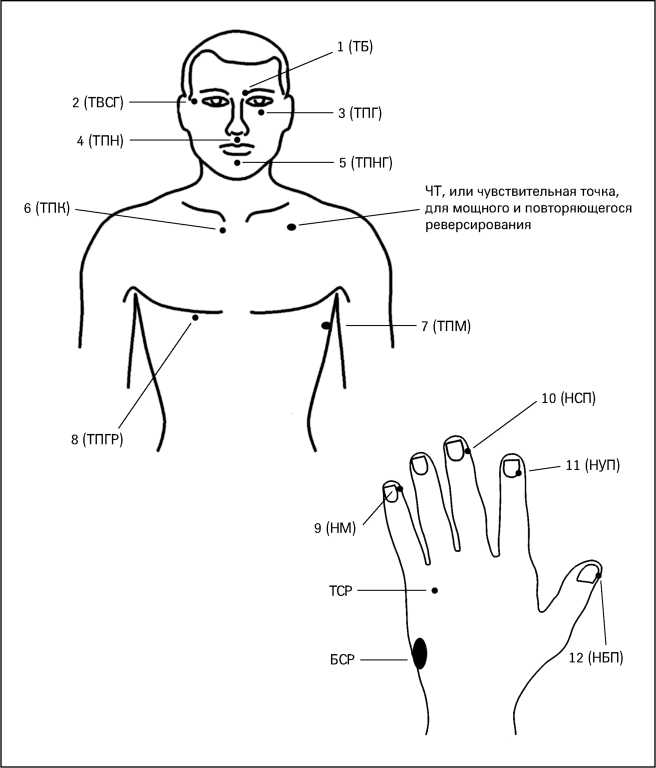 3. Посмотрите на табл. 28 и рис. 27, чтобы определить расположение ТБ, ТВСГ, ТПГ, ТПН, ТПНГ, ТПК, ТПМ, ТПГР, НМ, НСП, НУП и НБП. Думая о своем желании, пять раз легким постукиванием надавите на каждую из этих зон. Воздействуйте на них в следующей последовательности: 1, 2, 3, 4, 5, 6, 7, 8, 9, 10, 11, 12. Постукивание не должно вызывать боли, но быть при этом ощутимым.