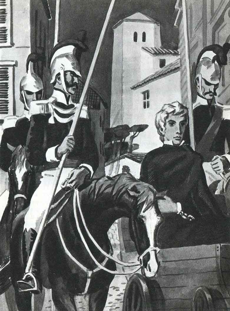 Накануне того дня, когда Миссирилли должны были привезти в Рим, Ванина придумала предлог, чтобы приехать в Читта-Кастеллана. В тюрьме этого города поместили на ночлег карбонариев, которых пересылали из Романьи в Рим. Утром, когда их отправляли из тюрьмы, она увидела Миссирилли: его везли в тележке одного, закованного в цепи; он был очень бледен, но, казалось, нисколько не пал духом. Какая-то старушка бросила ему букет фиалок. Миссирилли с улыбкой поблагодарил ее.