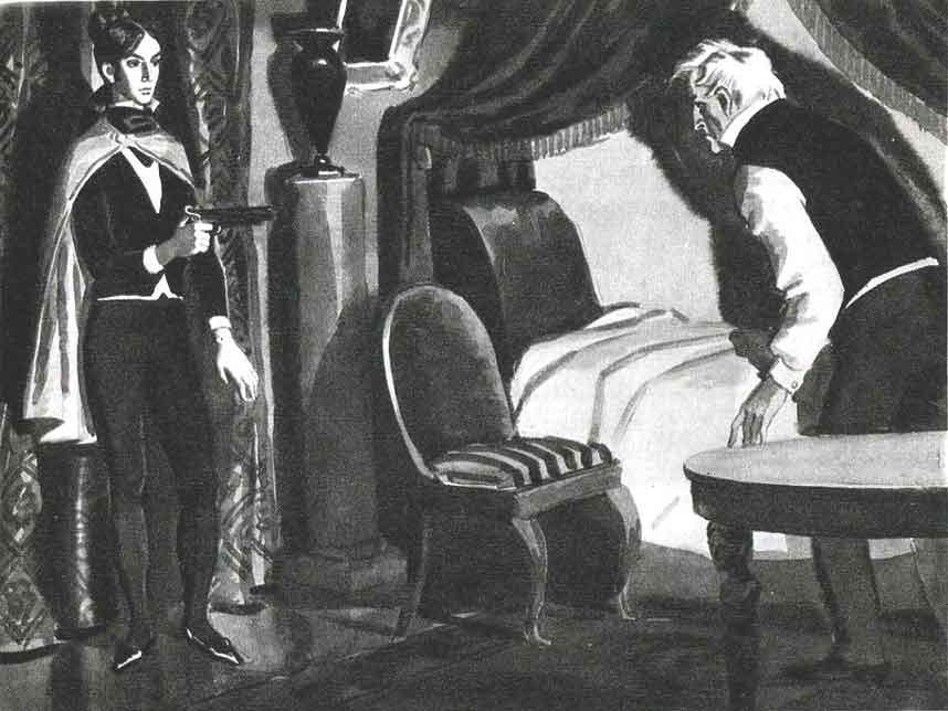 На другой день монсиньор Катанцара возвратился домой около полуночи и нигде не мог найти своего камердинера; весьма удивляясь этому, он позвонил несколько раз. Наконец на звонки явился дряхлый и выживший из ума слуга; министр потерял терпение и решил раздеться сам. Было очень жарко; заперев дверь на ключ, он сбросил с себя платье и, скомкав его, швырнул на стул. Платье было брошено с такой силой, что перелетело через стул, задело за муслиновую гардину, и позади нее обрисовалась человеческая фигура. Министр кинулся к постели и схватил пистолет. Когда он подошел к окну, из-за гардины выступил юноша в лакейской ливрее и шагнул к нему с пистолетом в руке. Увидев это, министр прицелился и уже хотел выстрелить, но юноша сказал ему, смеясь: