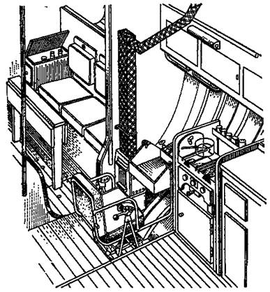 На рисунке рядом с камбузом показано подвесное кресло со столиком. С другой стороны кресла – керосиновый обогреватель с обрешеченным стояком и трубой, которые используются для сушки одежды.