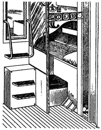 На рисунке показаны изголовье койки, панель с инструментами, сиденье, служащее одновременно ящиком для обуви. Складывающаяся дверь ведет в гальюн, на полу которого видна электропомпа. Панель со ступеньками трапа обрывается, открывая доступ к мотору. Между трапом и койкой – переборка, застекленная наполовину.
