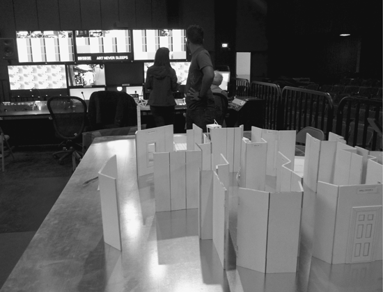 Для настоящей коммерческой постановки своего сценария «Дальновидения», действие которого происходит в многоквартирном доме 1920-х гг., я бы наклеил на панели обои и, возможно, добавил бы еще некоторые детали для оформления сцены вечеринки в квартире, но в рамках экспериментальной мастерской я не стал этого делать, чтобы панели можно было также использовать и для других сцен.