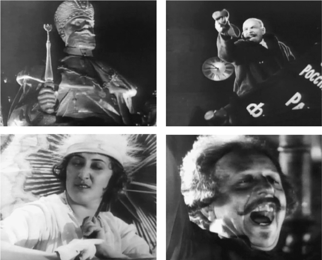 В начале фильма нам в деталях показывают статую царя – на экране чередуются кадры, которые дробят ее на отдельные части, почти как на картинах кубистов. Затем кадры выстраиваются в причинно-следственную цепочку: мы видим, как на памятник натягиваются веревки. Дальше чередование кадров используется для сопоставления противоположностей: в них появляются то винтовки, то косы. Потом следует почти лишенное логики повторяющееся действие: мы несколько раз наблюдаем с разных ракурсов, как царский трон падает с пьедестала. После чего на экране мелькают крупные планы поющих людей, а затем кадры с людьми перемежаются кадрами с взрывами военных снарядов.