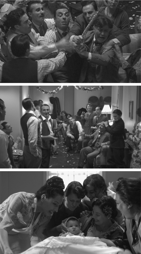 Я был уверен, что исключительно надежные и быстрые спортивные серверы повтора EVS могли бы сослужить «живому кино» очень неплохую службу, а потому решил испытать их в трудных ситуациях. Вот, например, такая: для сцены требуется многочисленная массовка, в том числе младенцы, дети и животные, но снимать все живьем очень затратно и проблематично, потому как возникает множество организационных вопросов. Для того чтобы одеть массовку – а в сцене, которую мы отрабатывали в Калифорнийском университете, все должны были быть в образах, – потребуется целый штат костюмеров, парикмахеров и гримеров; животным не обойтись без дрессировщиков; а дети находятся под контролем соответствующих государственных служб, и представители власти отслеживают на площадке, в каких условиях и как долго ребятишки работают, не грозит ли им опасность и не вредит ли участие в съемках их учебе. Малышей вообще разрешено снимать только по 20 минут в день (если взять близнецов, можно урвать 40 минут) и только в определенные утренние и дневные часы. Итак, я решил выяснить, удастся ли мне включить в постановку сцену с многочисленной массовкой в исторических костюмах, с детьми, младенцем, котом и козлом (согласно сюжету козел был подарком от дядюшки из Бронкса и двоим братьям следовало отвезти животное на метро в дом получателей, где его должны были съесть на торжестве по случаю крещения). Вопрос, который я задавал сам себе, звучал так: «Могу ли я собрать всех этих актеров (людей и животных), а также парикмахеров, гримеров, костюмеров, дрессировщиков и чиновников, отвечающих за детей, да к тому же привезти достаточное количество еды, чтобы накормить всю эту команду обедом, – но только на один день, так, чтобы мне уже не пришлось повторять все это в последующие дни работы над постановкой, начиная с первых читок, технических репетиций и репетиций в костюмах? Даст ли мне устройство EVS, которое используется для трансляций футбольных матчей, такую возможность?»