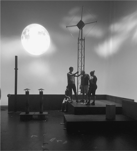Так, в Оклахоме я хотел разобраться с кинематографическим освещением: можно ли расположить все осветительные приборы на полу и как при этом задействовать беспроводные устройства со светодиодными лампами, работающие на батарейках? Я также хотел узнать, возможно ли в принципе отыграть полностью приблизительно 50 страниц сценария и что требуется для того, чтобы выстроить кадры так, как это делается в кино. В Калифорнии я намеревался разобраться с использованием модульных декораций (панелей Гордона Крэга), а также выяснить, можно ли извлечь пользу из серверов повтора EVS, применяемых при трансляциях спортивных мероприятий. Насколько такой полностью программируемый микшерный пульт, как свитчер DYVI, сможет облегчить задачу, когда мы будем пытаться жонглировать всеми этими многочисленными форматами: материалом с «живых» камер, записями с EVS, смонтированными заранее эпизодами, комбинированными изображениями, полученными с помощью зеленого экрана? Могу ли я за один день отснять сцены с массовкой в костюмах, детьми и животными, а потом разбавлять этими элементами «живое» представление? Можно ли снимать сцены на иностранном языке (неаполитанском диалекте итальянского) и сопровождать их субтитрами в режиме реального времени и сумею ли я вставить в фильм «живой» трюк? В результате этих двух мастерских я пришел к выводам, которые попытался изложить в этой книге.