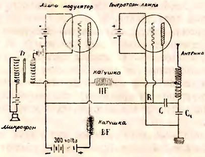 Для передачи же нот разной высоты, музыки или человеческой речи высота ноты определяется на посылающей станции в зависимости от природы тока в передающей антенне. Это не трудно сделать. Тебе не нужен особенно сильный передатчик. Представь себе, что кто-то говорит в микрофон, включенный в цепь постоянного тока. Ты знаешь, что волны звуков действуют на мембрану, которая изменяет сопротивление угольных зернышек в микрофоне и дает соответствующие колебания тока. Этот ток идет по первичной обмотке повышающего трансформатора, сильно увеличивающего напряжение тока, но сохраняет характер его колебаний. Ток высокого напряжения действует на сетку первой лампы. Эта лампа– усилитель низкой частоты. Его нить соединена по обыкновению с батареей накала, но напряжение на цилиндр от положительного полюса батареи высокого напряжения подано через катушку с большим коэффициентом самоиндукции.