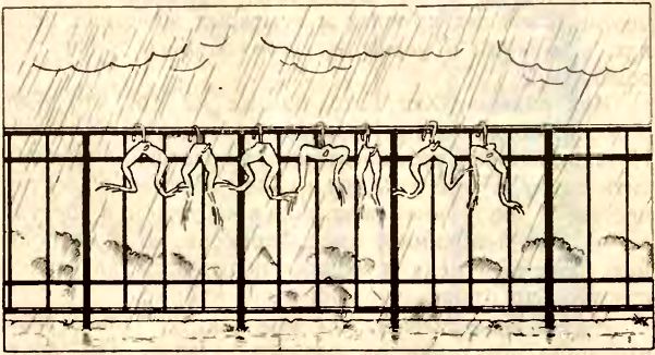– Это целая история, Хюг. Случилось это очень давно, в 1780 г., менее чем через 40 лет после изобретения лейденской банки Однажды знаменитый итальянский доктор по имени Гальвани, который был профессором физиологии Болонского университета, предпринял ряд опытов для изучения анатомии мускулов и нервов. Он купил на рынке много лягушачьих лапок от лягушек, которые были убиты в то же утро. Ты знаешь, что во Франции и Италии лягушачьи лапки считаются очень вкусным блюдом. И вот вскоре после того, как Гальвани принес домой свою покупку, его позвали обедать, и он повесил свою покупку на медные крючки, прикрепленные к железным перилам балкона. Это было чисто случайно – крючки эти он согнул из медной проволоки, которая валялась тут же.