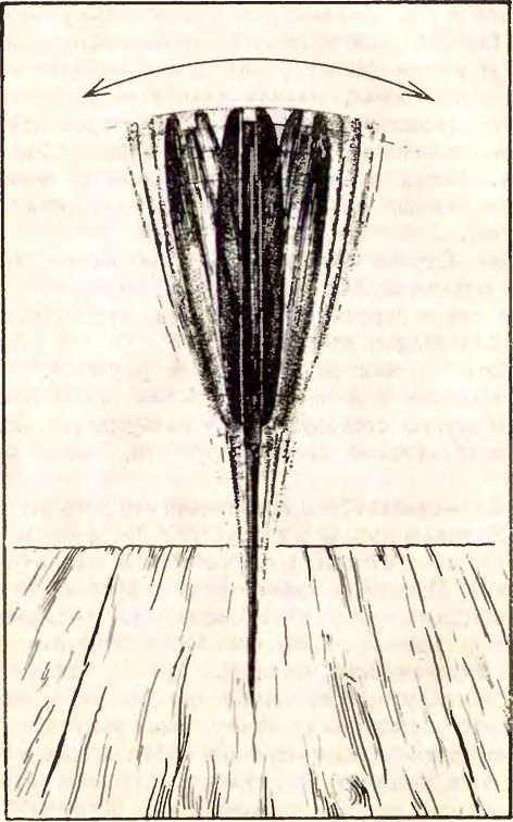 В тот же момент внутренность катушки размагничивается и теряет силу притягивать молоточек. Упругость отбросит его снова к винту. Но как. только прерыватель коснется винта, цепь замкнется. Снова пойдет ток, намагнитит мягкое железо, которое притянет молоточек, опять прекратив ток. Молоточек отлетит обратно, коснется винта и включит ток.