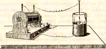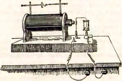 – Теперь смотри. Когда я закрою ток, замыкая цепь, ток сразу пойдет от положительного полюса батареи по проволоке к ключу, по проволоке к винту в деревянном стержне, вниз по стальной пружине (прижатой к винту), кругом первичной обмотки индукционной катушки и по обратной проволоке к отрицательному полюсу батареи.