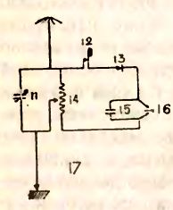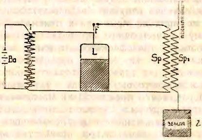 Первичная обмотка трансформатора возбуждается искровым промежутком в цепи, в которую включен сильный конденсатор из десяти лейденских банок; конденсатор заряжен от индукционной катушки, получающей первоначальный ток от батареи; обе цепи, в первую из которых входит батарея, индукционная катушка, конденсатор, искровой промежуток и первичная обмотка трансформатора, а в другую – вторичная обмотка трансформатора, настроенная при помощи изменения количества включенных витков настраивающей катушки (точка соприкосновения соединения с заземленным проводником должна скользить), пока колебания обеих цепей не будут одинаковы. Тогда можно сказать, что цепи настроены одинаково. В таком случае электрические колебания, возникающие в цепи конденсатора, вследствие заряда и разряда через искровой промежуток, создают соответствующие колебания в антенне подобного же рода и максимальной силы. Таким образом мощность энергии, исходящей от антенны значительно возрастает, так как вместо сильно затухающих колебаний, получавшихся от первоначального аппарата, антенна излучает слабо затухающие волны.