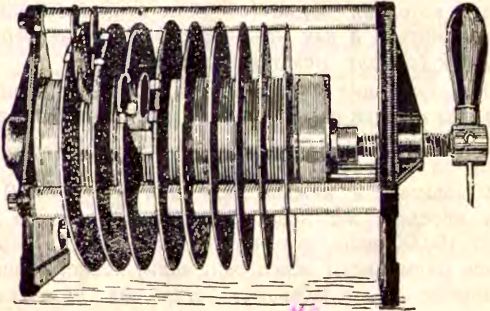 Маркони сделал большой шаг вперед по сравнению с Вином и Флемингом своим изобретением дискового разрядника, вращающегося с большой скоростью; стальной диск с выступающими по обе стороны шпеньками вращается с большой скоростью между двумя другими дисками, вращающимися в свою очередь под прямым углом к нему, и включенными в одну цепь с конденсатором.
