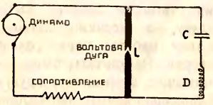 – Нет, этого нельзя назвать искрой теоретически, может быть, и трудно точно разграничить одно от другого. Дуговые разряды постоянны и почти непрерывны, искровые же временные и прерывающие. Кроме того, способ устройства и пользования дугой совершенно отличен от приборов с искрой. В 1910 г. англичанин Дудделль нашел, что если цепь, состоящая из самоиндукции и емкости, шунтирует дугу постоянного тока, дуга может издать музыкальный звук. Он предположил наличие колебаний и проверил это, включив в цепь измерительный инструмент.