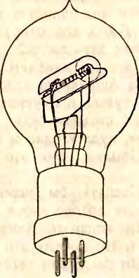 – Катодная лампа, часто называемая вентилем Флеминга, очень похожа на обыкновенную электрическую лампочку. Но если вы присмотритесь к ней, то увидите, что в ней заключены не только нити для освещения. В ней находятся три вещи: проволочные нити, которые при накаливании дают свет, сетка, сплетенная из проволоки и металлический цилиндрик. Нити двумя кончиками соединяются с батареей, так что образуется замкнутая цепь и является свет. Сетка и цилиндр имеют по одному концу, так что их цепи не замкнуты.