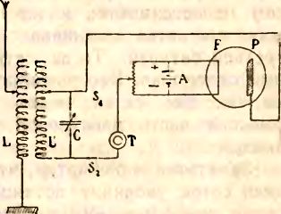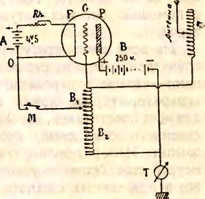 Помните также, что сетка индуктивно соединена с антенной. Когда радиоволны большей частоты пронизывают антенну, они воспринимаются сеткой очень ясно, благодаря маленькому конденсатору, шунтированному большим сопротивлением, помещенному в сетке.