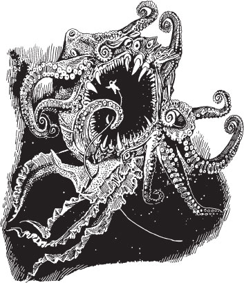 На краю полки Жена держала квадратные бутылки с джином. Над полкой старая олеография висела так высоко и была так густо покрыта жирной копотью, что оставалось только гадать, что это за глыба в окружении завитушек – кашалот, выбросивший струю воды в штормовом море, или космический корабль, летящий в вихрях звездной пыли.
