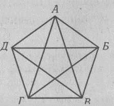 Каждый из друзей обозначается на нем точкой. Точек пять. А рукопожатие обозначается отрезком, соединяющим две точки. Так отрезок АВ на этом чертеже обозначает, что друзья А и В пожали друг другу руку. Видно, что отрезков всего 10.