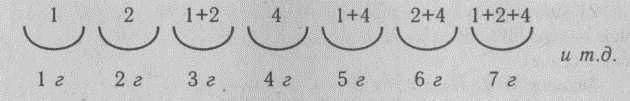 Замечание для учителя: эти числа (1, 2, 4 и 8 г) – степени числа 2. Продолжая этот ряд гирь, мы получим возможность минимальным числом гирь отмеривать любые веса с использованием для гирь одной чаши весов.