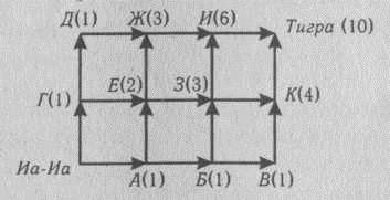Задача 112. На этой карте показаны домики Иа-Иа и Тигры и дорожки между ними. Сколько существует путей между этими домиками по этим дорожкам?