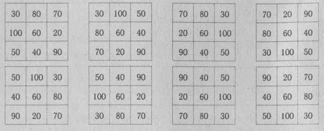 Смотри задачу 59. Центр заполняется числом 60, так как это единственное число, входящее в четыре тройки, дающие в сумме 180, а центральная клетка входит в один столбец, одну строку и две диагонали, то есть участвует в четырех суммах. Верхний левый угол можно заполнить любым из чисел 30, 50, 70 и 90, так как каждое из этих чисел входит в три тройки. После этого нижний правый угол заполняется однозначно. Верхний правый угол заполняется одним из двух оставшихся чисел, входящих в три тройки, после чего весь квадрат заполняется однозначно.