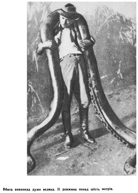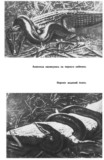 Наводжу об'єктив на плазуна, але навіть не встигаю натиснути на скобу, бо вода біля берега зненацька захвилювалась, і з води повільно виповзла величезна, завдовжки метрів шість анаконда. Це неабиякий екземпляр водяних полозів. Я аж прикипів на місці. Анаконда раптом звертає і погрозливо, повільно повзе до каймана. В її рухах відчувається обережність і хижість. Це повзе смерть для живої істоти. Я не раз уже чув ночами, як десь у воді відбувалася боротьба не на життя, а на смерть. Кайман і анаконда, ці д» з царі тропічних вод, – вічні, непримиренні вороги.