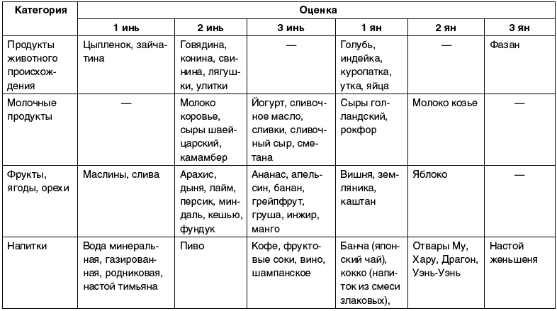 Разумеется, таблица не может вместить все разнообразие продуктов. Тем не менее из нее становится понятно, что инь в пище преобладает над ян. Создавая человека, Творец предполагал, что в нем в равной степени будут сочетаться телесное и духовное. Но на практике в нас преобладает земное начало. Люди больше пекутся о теле и гораздо реже поднимают глаза к небу. В этом и заключается причина такого деления.